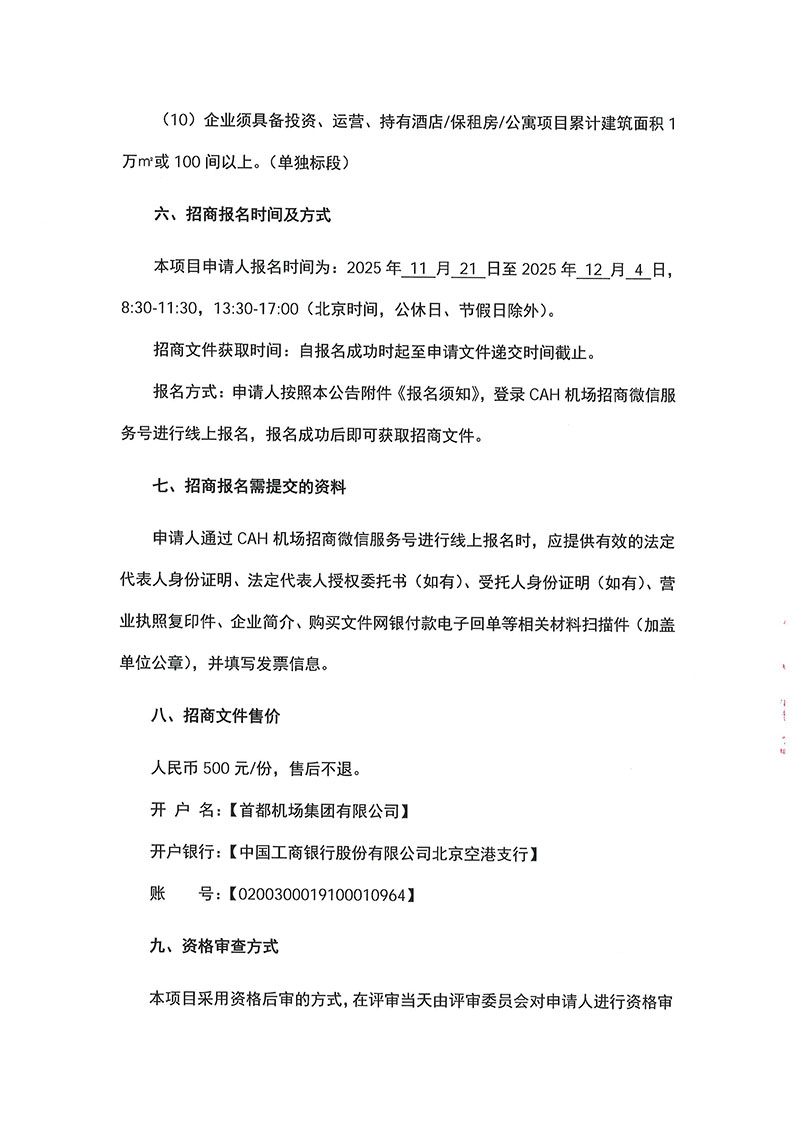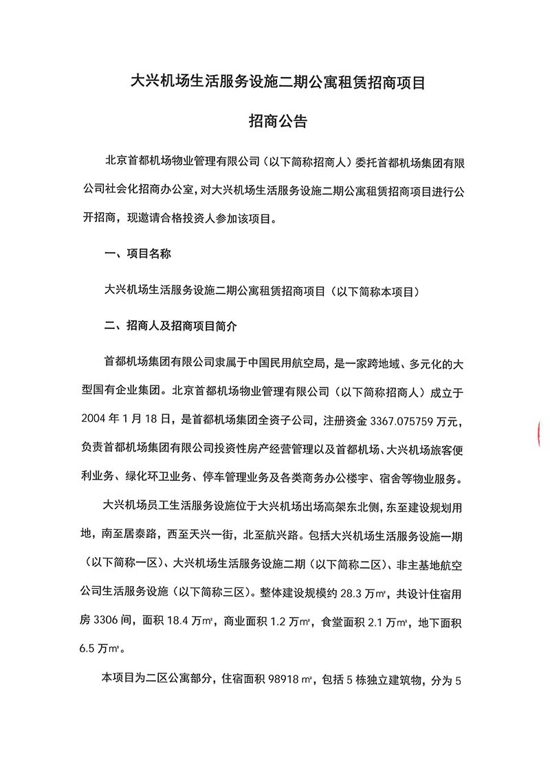 大兴机场员工生活服务设施位于大兴机场出场高架东北侧,东至建设规划用地,南至居泰路,西至天兴一街,北至航兴路。包括大兴机场生活服务设施一期(以下简称一区)、大兴机场生活服务设施二期(以下简称二区)、非主基地航空公司生活服务设施(以下简称三区)。整体建设规模约28.3万平米,共设计住宿用房3306间,面积18.4万平米,商业面积1.2万平米,食堂面积2.1万平米,地下面积6.5万平米。本项目为二区公寓部分,住宿面积98918平米,包括5栋独立建筑物,分为5个标段:标段1:1号楼,15429.59平米,304间;标段2:2号楼,25193.5m3,479间;标段3:3号楼,26052.35平米,492间;标段4:4号楼,15193.16平米,294间;标段5:5号楼,17049.59平米,315间。每个标段均为现状整体租赁模式,租赁范围为标段建筑面积及建筑物内现状资产。租赁期限:自起租日起6+10年,6年租赁期届满前6个月,承租人满足相关续约条件。