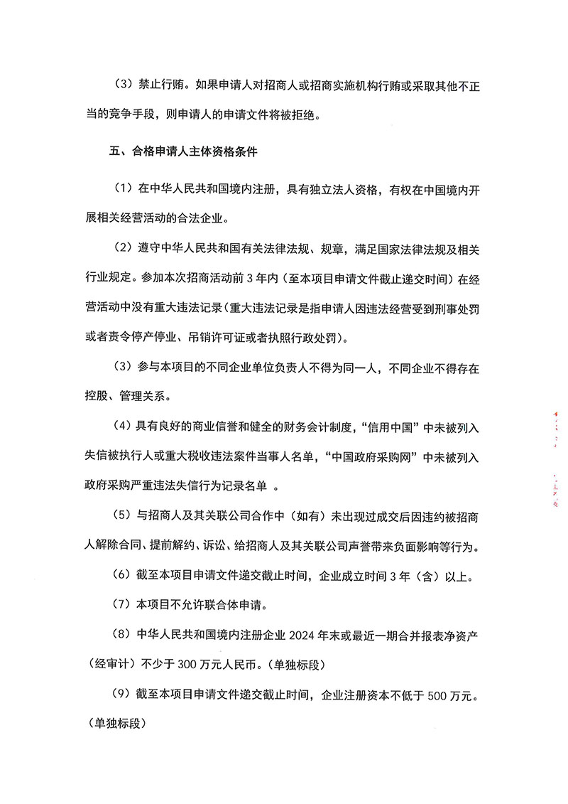 (2)遵守中华人民共和国有关法律法规、规章,满足国家法律法规及相关行业规定。参加本次招商活动前3年内(至本项目申请文件截止递交时间)在经营活动中没有重大违法记录(重大违法记录是指申请人因违法经营受到刑事处罚或者责令停产停业、吊销许可证或者执照行政处罚)。