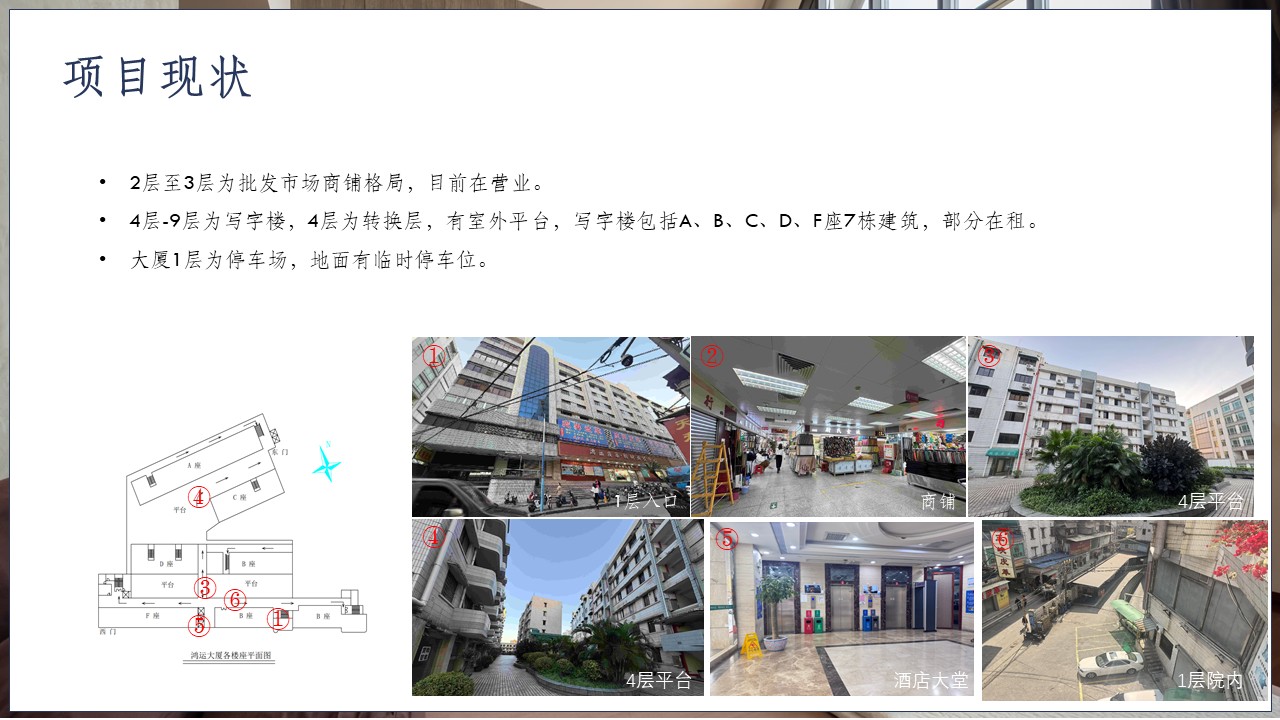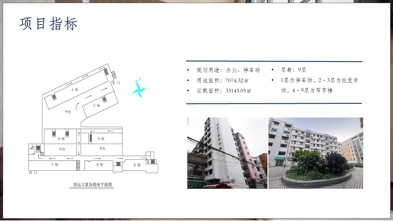 鸿运大厦项目位于广东省广州市越秀区站西路37号,地处越秀北片区,靠近广州火车站和省汽车客运站,交通便捷。周边公共服务、配套设施完善,专业市场发展成熟。项目用地面积7074.32㎡,证载面积33145.05㎡,规划用途是办公、停车场;共9层,1层为停车场,2–3层为批发市场,4–9层为写字楼。