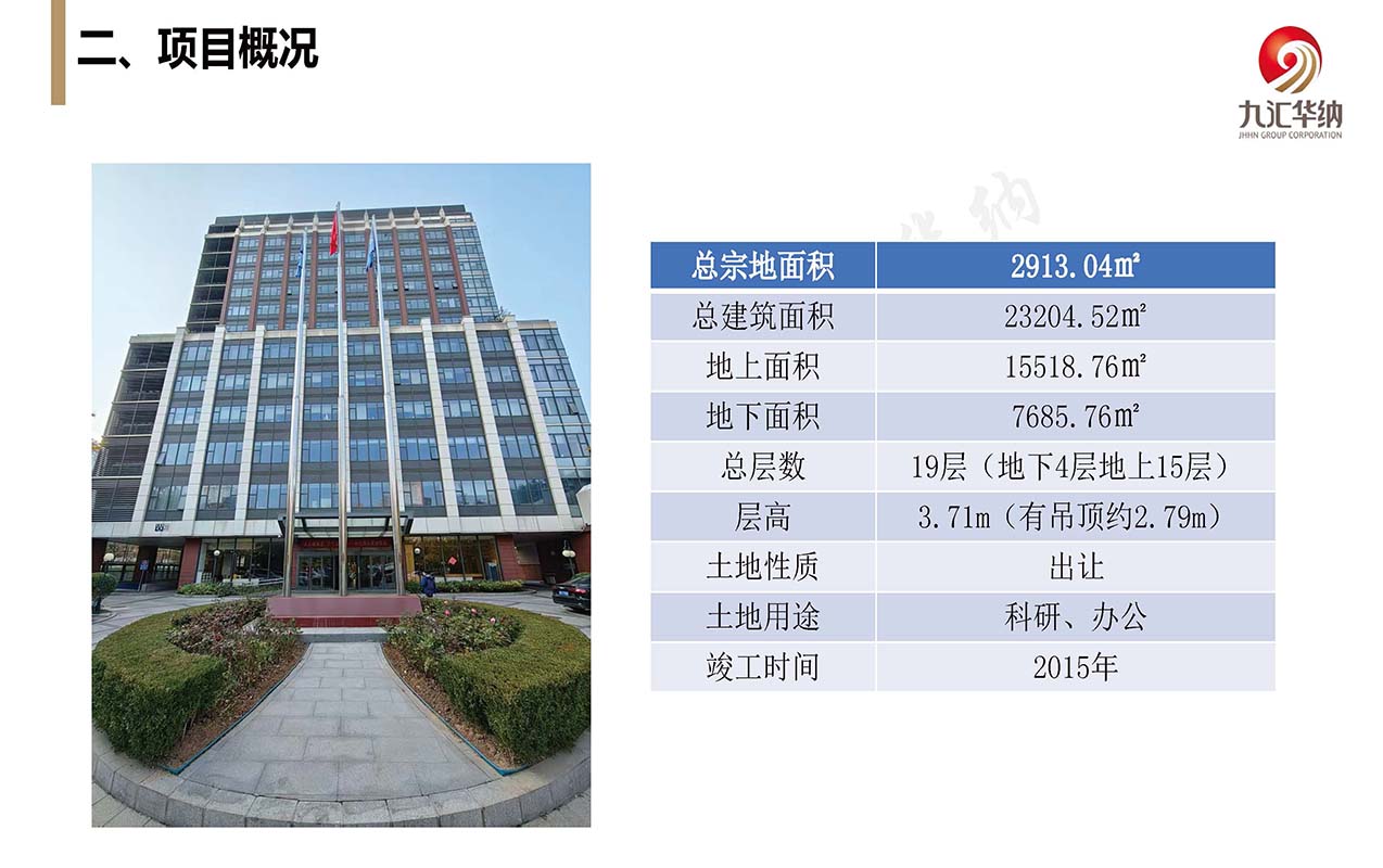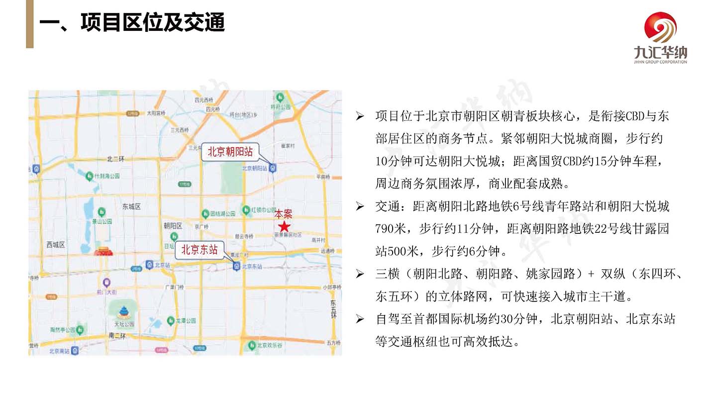 (1)项目位于北京市朝阳区朝青板块核心,是衔接CBD与东部居住区的商务节点。紧邻朝阳大悦城商圈,步行约10分钟可达朝阳大悦城;距离国贸CBD约15分钟车程,周边商务氛围浓厚,商业配套成熟。(2)项目总宗地面积2913.04㎡,总建筑面积23204.52㎡,地上面积15518.76㎡,地下面积7685.76㎡,总层数19层(地下4层地上15层),层高3.71m(有吊顶约2.79m),2015年竣工,土地性质是出让,规划用途科研、办公。