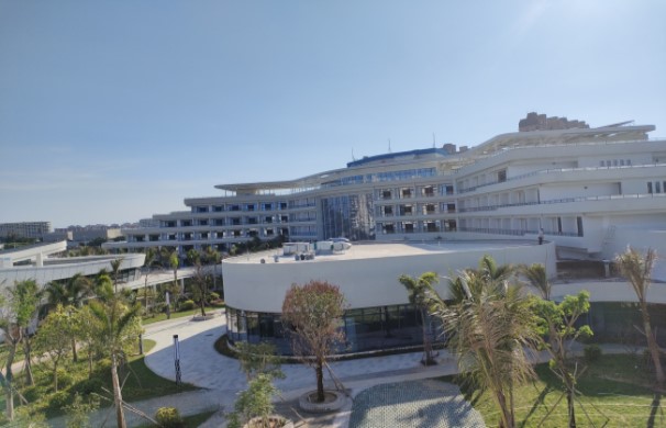 (1)本项目位于海南省陵水黎族自治县中国电科海洋信息产业基地内,靠近海南环岛高速英州互通路出口附近,距三亚凤凰国际机场约58KM(车程约1小时),距陵水县政府和陵水火车站约28KM(车程约30分钟),距清水湾景区约4KM。(2)项目建筑面积23861.65㎡,主体建筑结构为框架结构,住宿房间总规模约为193间,设置在南侧1-5层,房间类型主要包括标准单人房、标准双人房、公务房以及残疾人客房,标准间面积为34㎡。北侧1-2层为会议室及培训教室,其中大会议室1个、小会议室3个、培训教室4个。主楼负一层停车场有地下停车位42个,地上停车位34个。