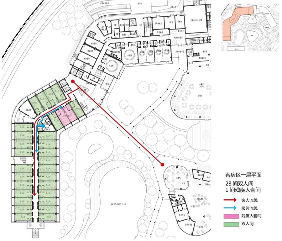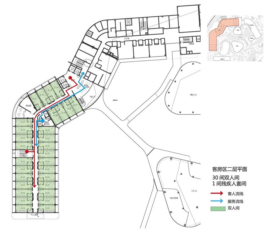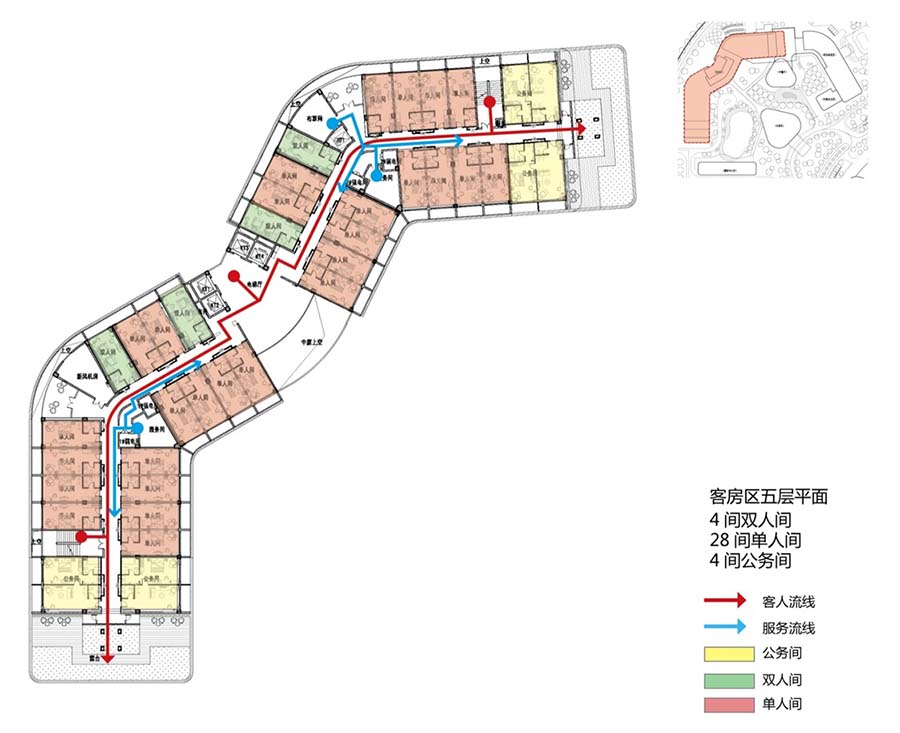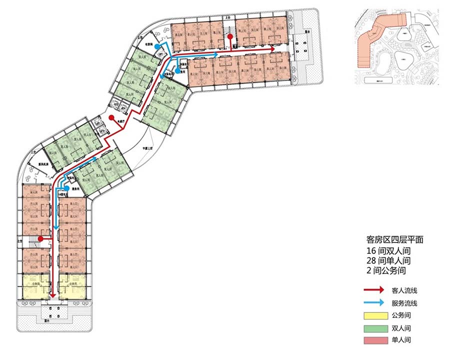 客房总规模为193间,设置在主楼南侧1-5层,房间类型主要包括标准单人房、标准双人房、公务房以及残疾人客房。